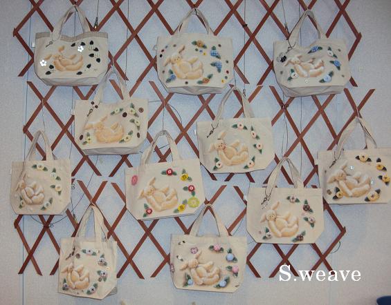 ←作品展恒例、フレンドシップコーナー。今回はT-P岸本先生のバニーを布バッグに描きました。周りはヨーヨーキルトやボタンで自由にアレンジ♪