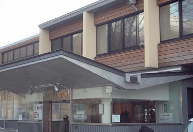 ナマハゲの後ろに見える温泉宿へ。