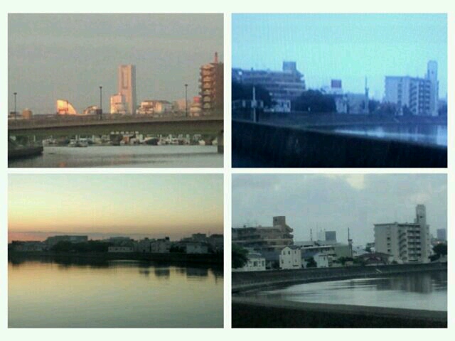 遠くに見えるランドマークタワーに、朝日があたって綺麗〜
